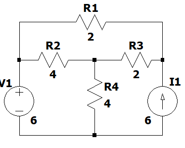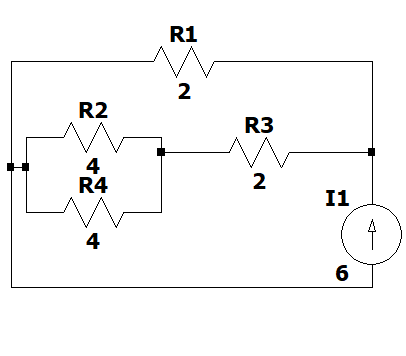 $$i_1 = \frac{6}{\frac{(R1+R3) \times R2}{(R1+R3)+R2}+R4} = \frac{6}{2 + 4}= 1 [A]$$