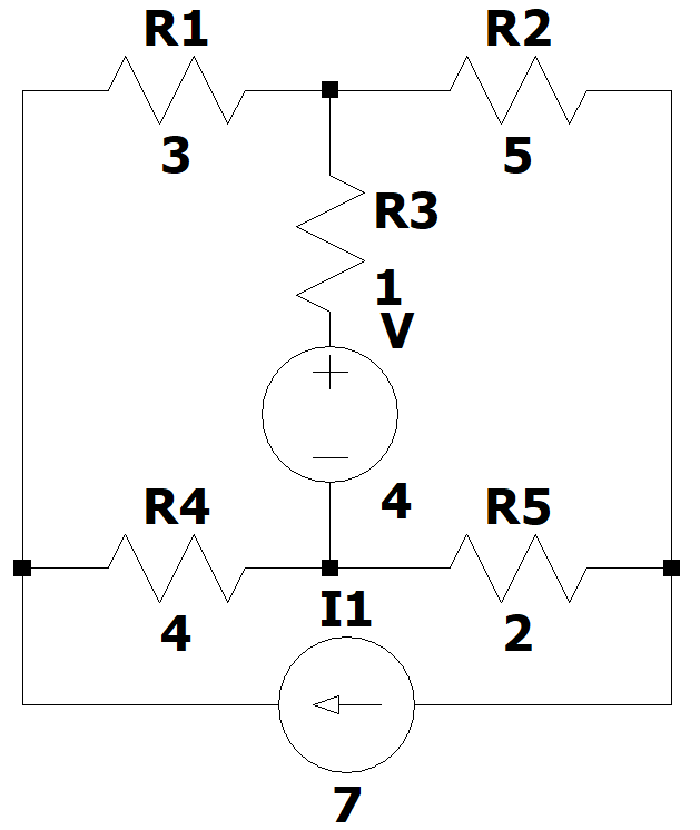 R1とR2の合成抵抗が8Ωで、R4とR5の合成抵抗が6Ωですから電流源7Aの分流比は解きやすい値になってますね。R1+R2のほうが\(7 \times \frac{6}{8+6} = 3 \)A, R4+R5のほうが4Aですね。なので、1-1’間の電圧は7Vということになります。(1が\(3 \times 5 = 15\)V, 1’が\(4 \times 2 = 8\)Vなので、15-8=7)