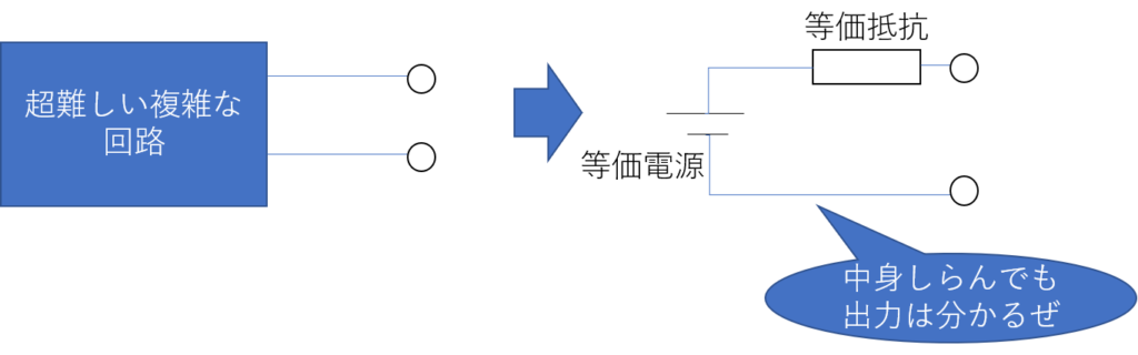 複雑な回路があったとしても、外側から見た時にはシンプルな等価回路とみなして扱うことができるよーという定理
